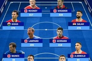 中场:吉格斯(276球)、兰帕德(295球)、杰拉德(218球)、萨拉赫(278球)