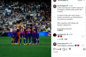 “我们倾尽全力,但征程仍在继续,未来还有很多比赛,此刻我们已经专注于接下来的比赛。为球队的努力感到无比自豪,继续前进!巴萨永远前进!”